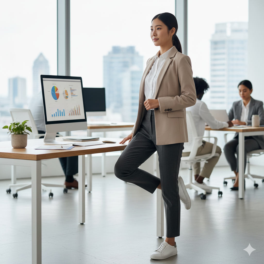 - 실천: 벽 스쿼트, 까치발 들기(카프 레이즈) 등 자리에서 할 수 있는 하체 운동을 점심시간에 5분간 수행합니다.