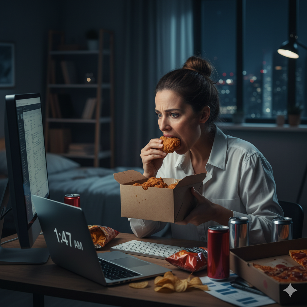 - 기초대사율 저하: 이러한 예측 불가능한 패턴은 장기적으로 몸의 **'열량 절약 모드'**를 활성화시켜 평상시 소모하는 에너지인 기초대사율을 낮춥니다. 즉, 이전과 똑같이 먹어도 살이 더 잘 찌는 **'대사 비효율 상태'**로 전환될 가능성이 높습니다.